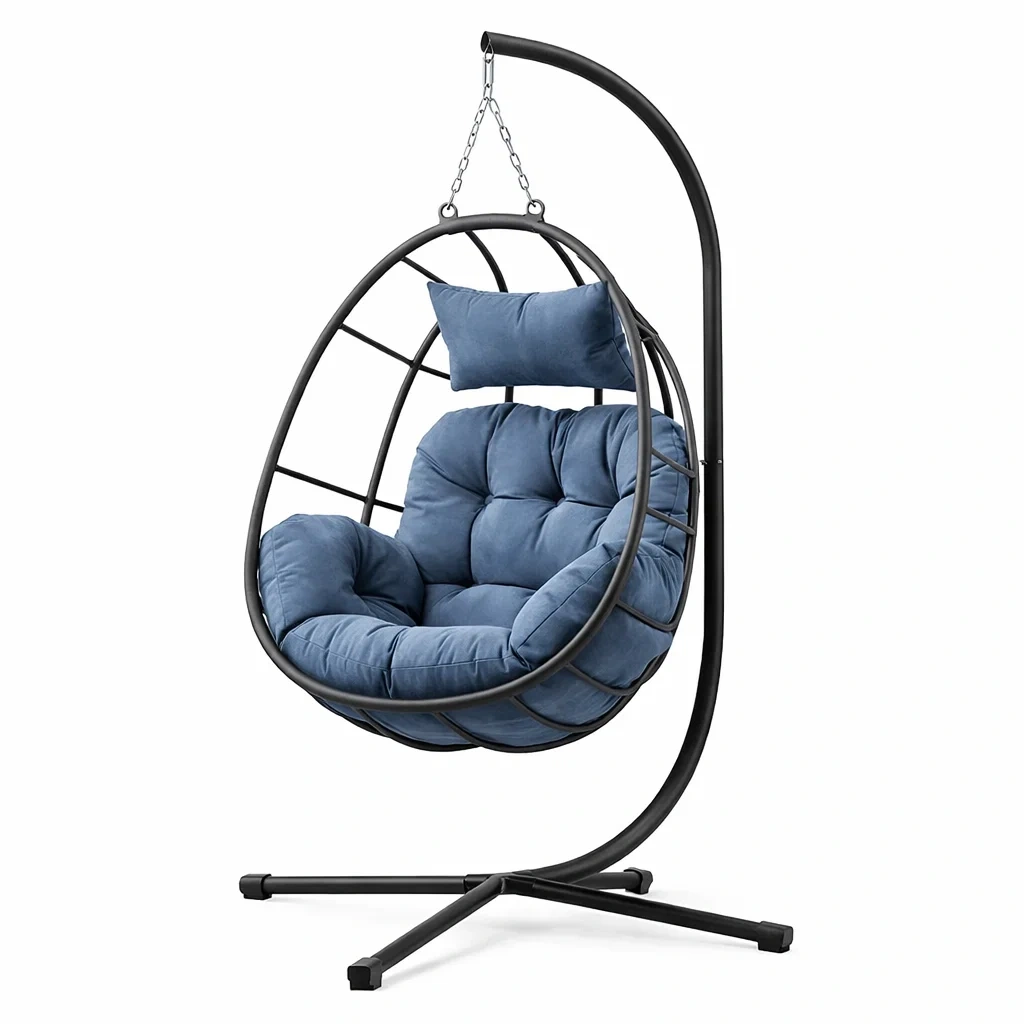Dieser Hängesessel in Ei-Form verfügt über einen stabilen Stahlrahmen und blaue Polyesterpolsterung. Die Gesamthöhe beträgt 195 cm und der Sitzbereich misst 120 cm x 100 cm. Die maximale Tragfähigkeit beträgt 120 kg.