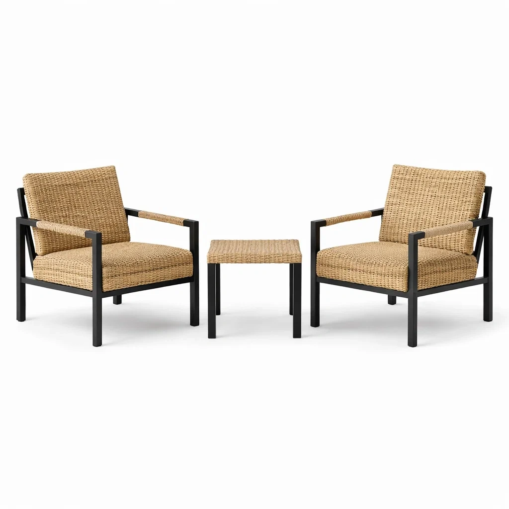 Loungeset aus Rattan mit Aluminiumrahmen Braun Schwarz mit 2 Sesseln und 1 Tisch