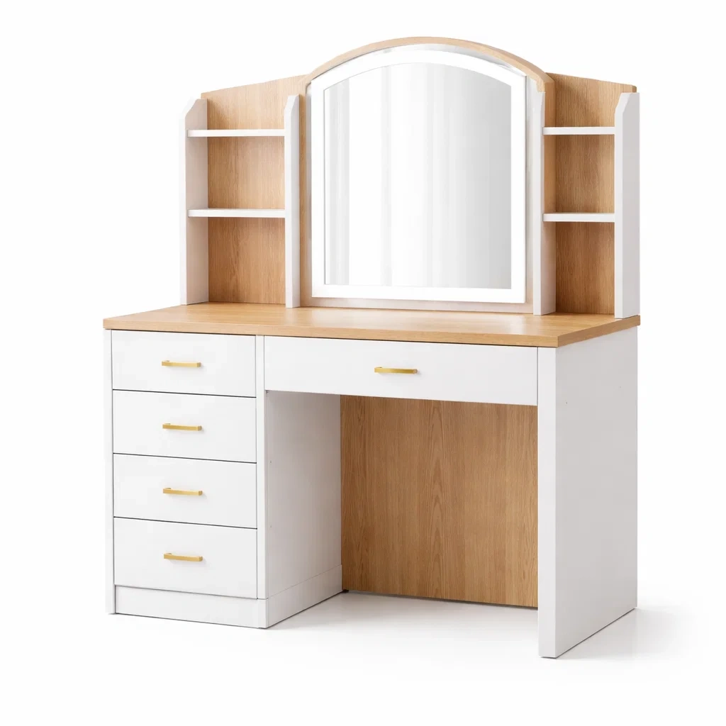 Schminktisch aus MDF Holz Weiß Natur mit Spiegel und Regalen und 5 Schubladen