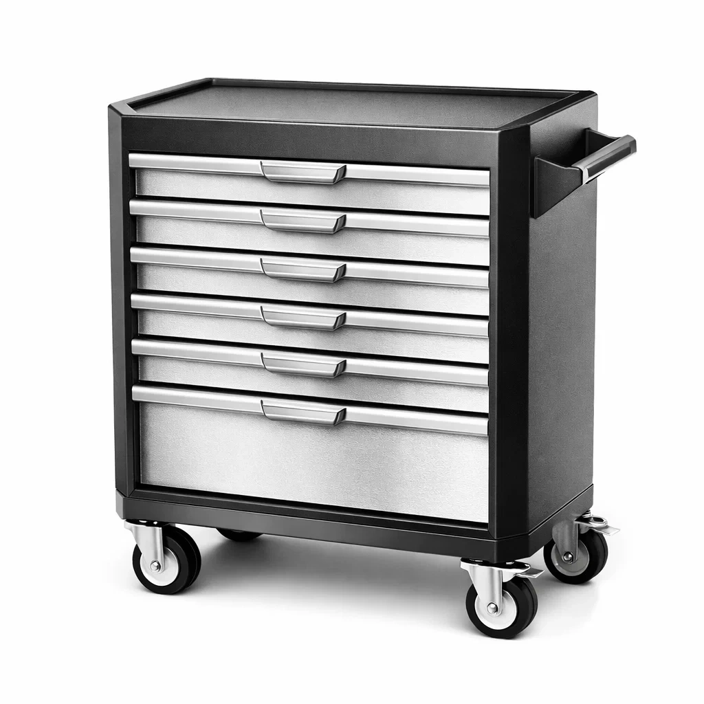 Material: Rahmen aus Stahl, Schubladen aus Edelstahl, Griffe und Räder aus Polypropylen.